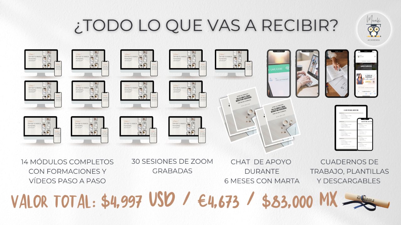 - 30 Sesiones de Coaching Grabadas: Obtén orientación y respuestas de Marta en 30 sesiones grabadas, adaptadas a tus necesidades de aprendizaje. (Valor: $2,000 USD)
